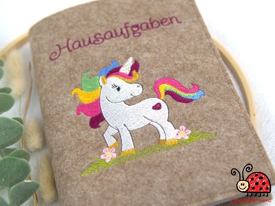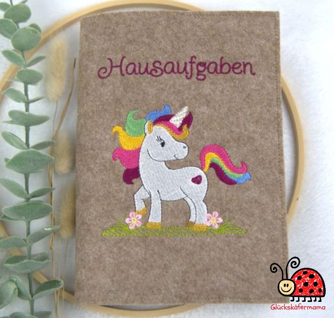 Handgemachte Hausaufgabenheft-Hülle aus stabilem Filz - farbenfroh bestickt mit magischem Einhorn
