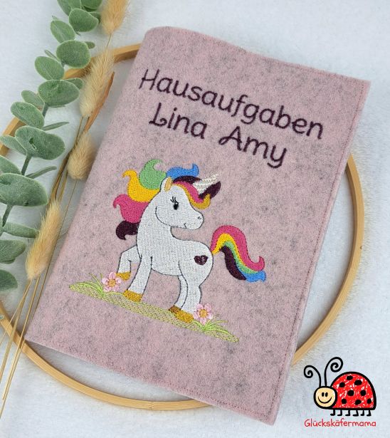 Handgemachte Hausaufgabenheft-Hülle aus hochwertigem Filz - bunt bestickt mit magischem Einhorn