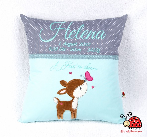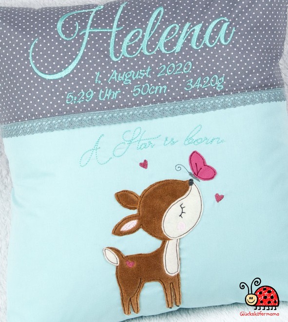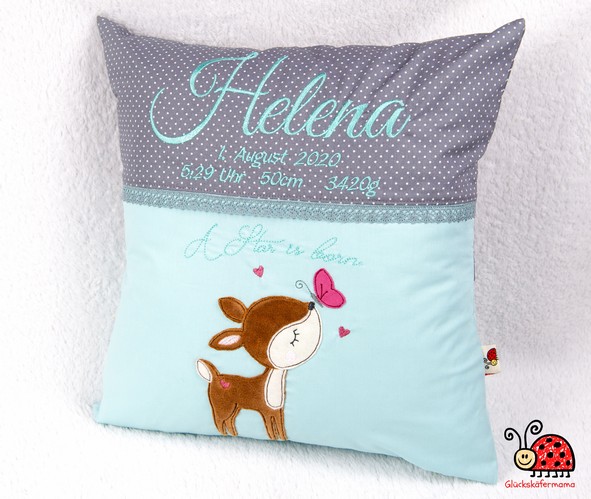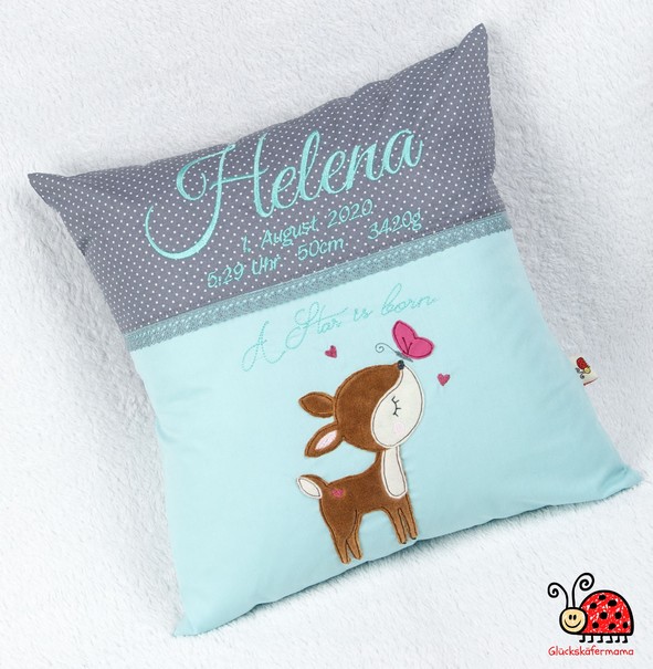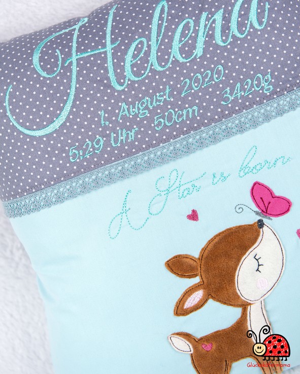 Die Kissenhülle aus mintfarbenem und grauen Baumwollstoff mit weißen Tupfen wird bestickt mit deinen Wunschangaben und dem zauberhaften Rehkitz sowie dazugehörigem Spruch. Sie besteht aus den beiden Farben und einem passenden Zierband. Auf der Rückseite befindet sich ein praktischer Hotelverschluß - nichts drückt beim Kuscheln und er ermöglicht zugleich schnelles Ab-/Beziehen zum Waschen.