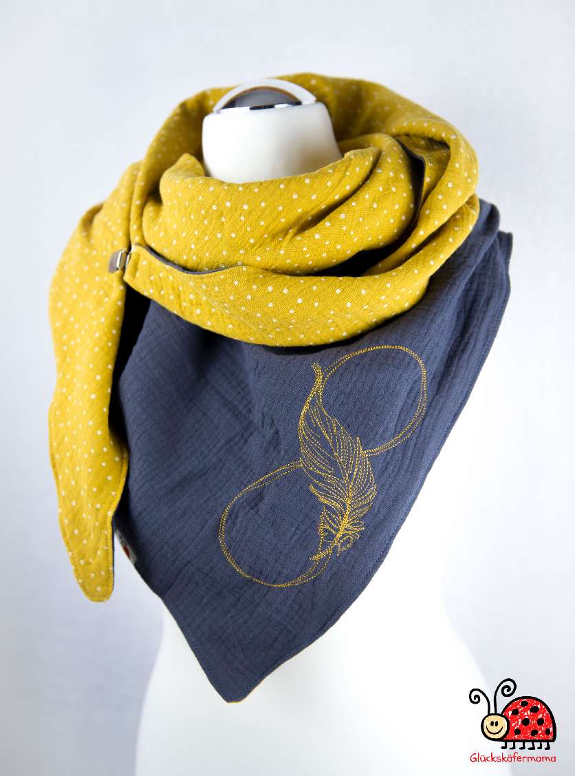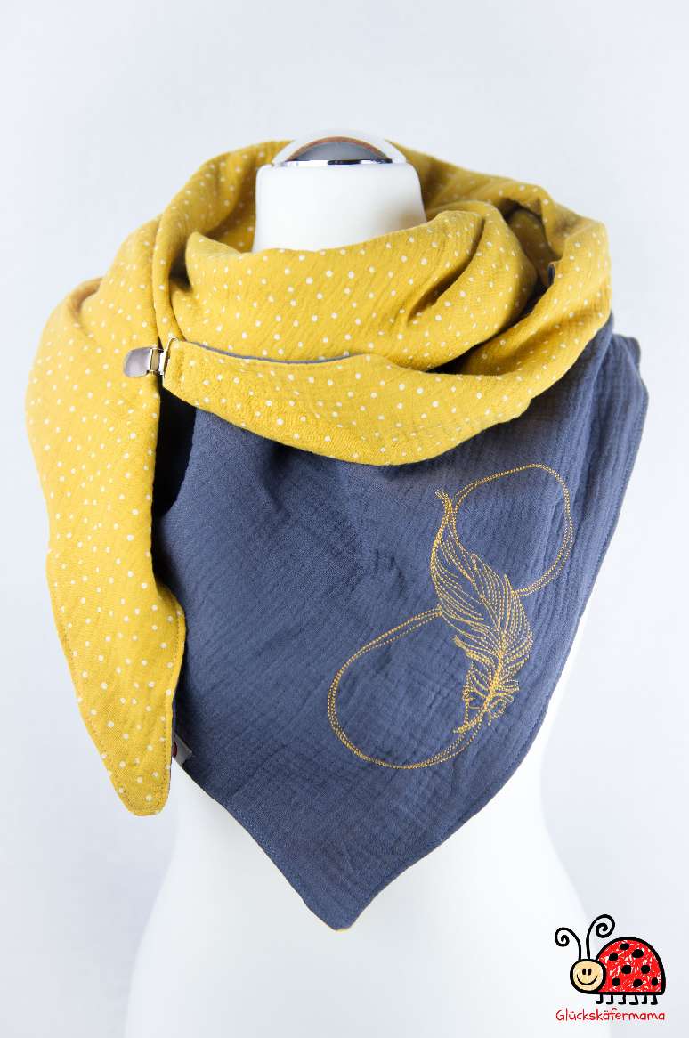 Kuschelig, vielseitig und stilvoll: Dieses XL-Musselintuch ist der perfekte Begleiter für gemütliche Herbsttage. Die Vorderseite in elegantem Dunkelgrau wird von einer zarten, senffarbenen Stickerei geschmückt – ein Unendlichkeitszeichen mit einer leichten Feder, ein Symbol für zeitlose Eleganz und Leichtigkeit. Auf der Rückseite setzt das senffarbene Muster mit weißen Pünktchen fröhliche Akzente und sorgt für einen charmanten Hingucker.